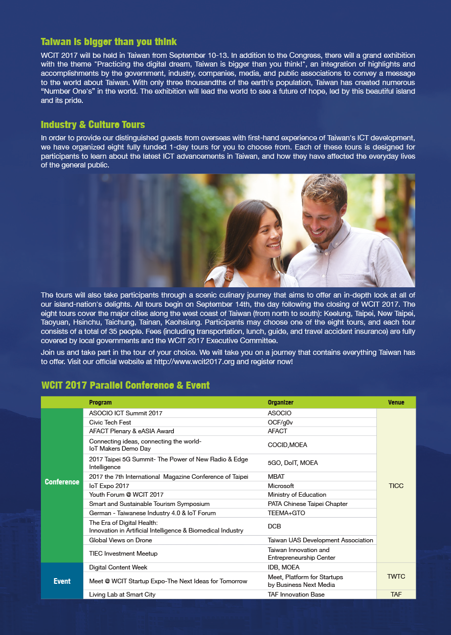 The Embassy wishes to inform the general public that the 21st World Congress on Information Technology (WCIT), as s premier international IT forum, will be held at Taipei International Convention Center (TICC) in Taiwan from 10th-13th September 2017, while its relevant exhibition venue will be at Taipei World Trade Center (TWTC), Exhibition Hall I. Bringing together over 2,500 visionaries, industry and government leaders, and academics from more than 80 countries, it is an event of unprecedented scope and scale. The theme of WCIT 2017 Taiwan is “Living the Digital Dream”.