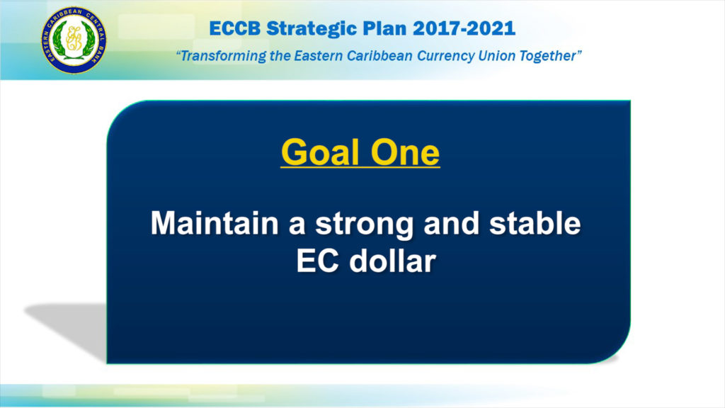 The first of the five strategic goals of the Bank’s Strategic Plan is to: “Maintain a strong and stable EC Dollar”. The goal focuses on protecting and augmenting the currency union’s pool of foreign reserves that supports a strong and stable EC dollar. As of 29 September 2017, the EC dollar was backed with 98.3 per cent of foreign reserves.