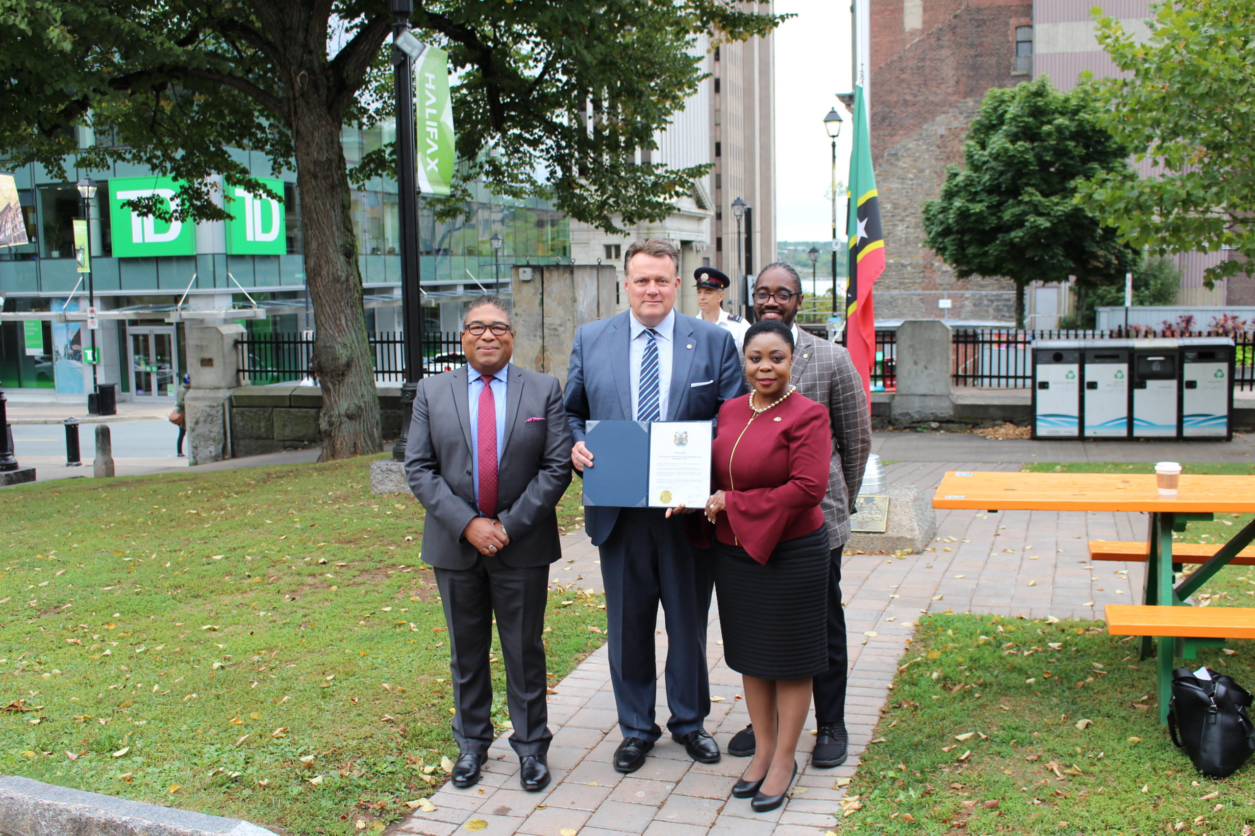 In Halifax, a city whose trade with the Caribbean goes back centuries, the city’s Mayor Mike Savage noted the “long history of trade, cooperation and friendship” between our two nations. In presenting a copy of the city’s proclamation to H.E. Sherry Tross, High Commissioner of St. Kitts and Nevis to Canada, during the flag raising ceremony, Mayor Savage also noted the “vibrant community of Canadians” from the St. Kitts and Nevis diaspora who have made major contributions. Nationals and friends also participated in the ceremony.