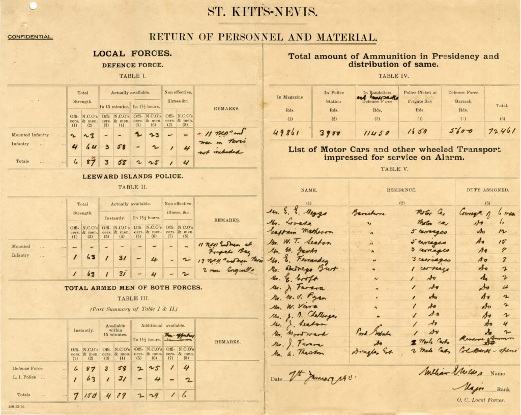 This year marks the centenary of the end of the First World War. It started in Europe on the 28 July 1914. Although much of the fighting took place in Europe, large navies which included a growing number of submarines, and the new invention of the aircraft meant that the war could easily spread to other parts of the world, and it did. Because of these concerns the Colonial Administration on St. Kitts started monitoring the availability of local resources. This sheet, the original of which was sent to the Command in Antigua, is contained in Secret file No 460 with a start date of the 25th November 1914.