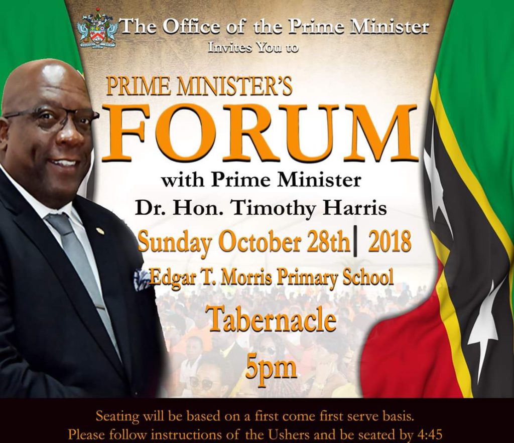 BASSETERRE, St. Kitts, October 26, 2018 (Press Unit in the Office of the Prime Minister) – Prime Minister Dr. the Honourable Timothy Harris and members of his Team Unity Cabinet will engage with constituents of St. Kitts and Nevis in a town hall-styled meeting, dubbed the Prime Minister’s Forum, this Sunday, October 28, 2018 from 5:00pm at the Edgar T. Morris Primary School in Tabernacle.