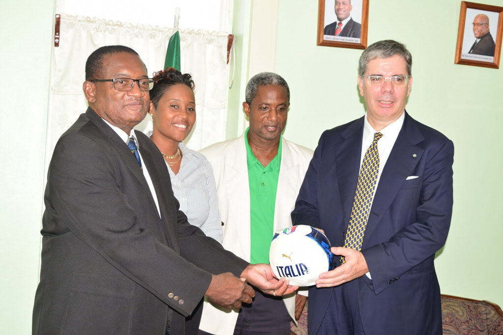 The presentation stemmed from a request made by the Honourable Eugene Hamilton for some footballs from the Government of Italy, via the resident Honorary Vice Consul of Italy to St. Kitts-Nevis, Mr. Ernest Amory. Mr. Amory worked along with Ambassador Ambrosetti, who resides in Panama, to secure the footballs for St. Kitts and Nevis. The Ambassador made the trip to St. Kitts and Nevis to personally present the footballs as a fulfillment of the request made by Minister Hamilton.