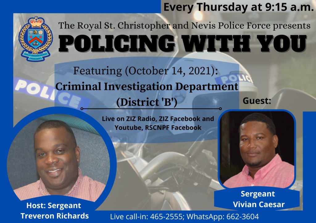 The High Command of The Royal St. Christopher and Nevis Police Force took a bold step some years ago to give District ‘B’ its own Criminal Investigation Department (CID). Sergeant Vivian Caesar joins host, Sergeant Treveron Richards, on “Policing With You” on Thursday, October 14, 2021, to share insights into the work of the department. “Policing With You” is aired every Thursday on ZIZ radio from 9:15 a.m. You can also watch it live on the Facebook Pages of The Royal St. Christopher and Nevis Police Force and ZIZ Broadcasting, or catch it on the YouTube Channel of ZIZ Broadcasting. Have a question for our guests? Post it on any of our social media platforms, call 465-2555 or send it via WhatsApp at 662-3604.
