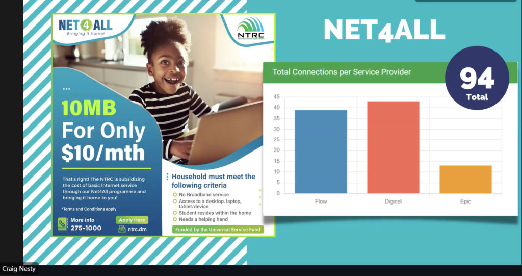 Mr. Craig Nesty, the Executive Director of NTRC Commonwealth of Dominica indicated that their consumer protection initiative is underway. Their website has been updated to ensure itis more consumer centric, he also noted that customers are being encouraged to file complaints using the correct channel instead of airing their grievances on the radio. Some of the initiatives being undertaken by the NTRC include the staging of Code Camp Caraibe for children 8 to 16 years geared at providing computer literacy and problem-solving skills and the launching of the Net4All initiative which provides broadband services for $10EC per month to persons in need.