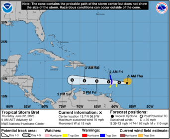 On the forecast track, the center of Bret is expected to approach the Lesser Antilles on Thursday, June 22, 2023. Bret is expected to move across the island chain by Thursday evening into Thursday night, and then move westward across the eastern and central Caribbean Sea Friday and Saturday, June 23 and 24, 2023, respectively.