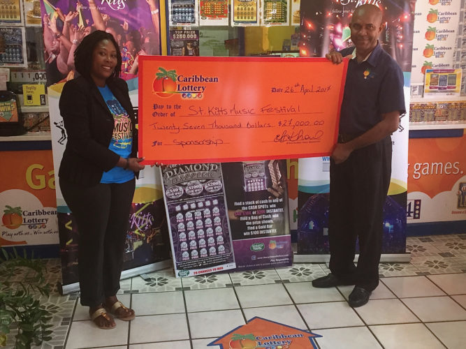 In a brief ceremony at the Caribbean Lotto’s corporate office on Wednesday, 26th April, Caribbean Lotto Marketing Manager Cecil Greene handed over a cheque in the amount of EC$27,000 to Karen Ford, the head of the Sponsorship Committee of the St. Kitts Music Festival.