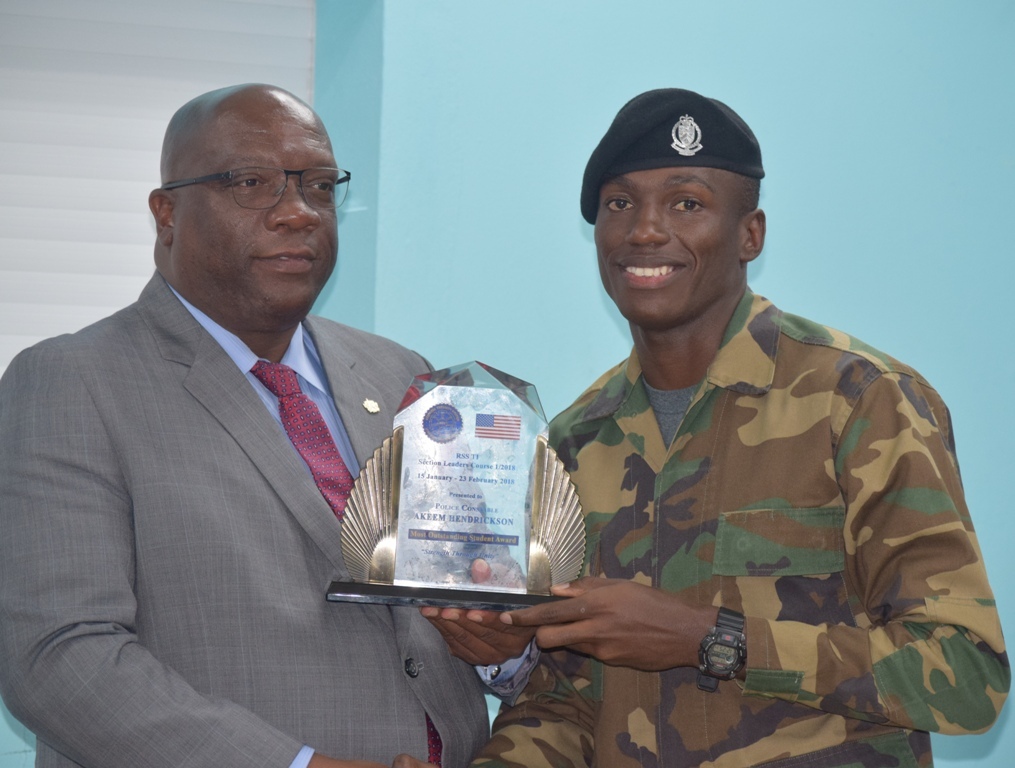 Basseterre, St. Kitts, February 26, 2018 (RSCNPF): The Regional Security System (RSS) Training Institute (TI) Section Leaders Course 2018 wrapped up on Friday, February 23 with an officer from the Royal St. Christopher and Nevis Police Force (RSCNPF) being named the top performer. Constable Akeem Hendrickson from the Crime Scene Unit, was given the Most Outstanding Student Award for his performance during the intense six-week training course. He described the course as “challenging,” but added that it was very “educational” as well.