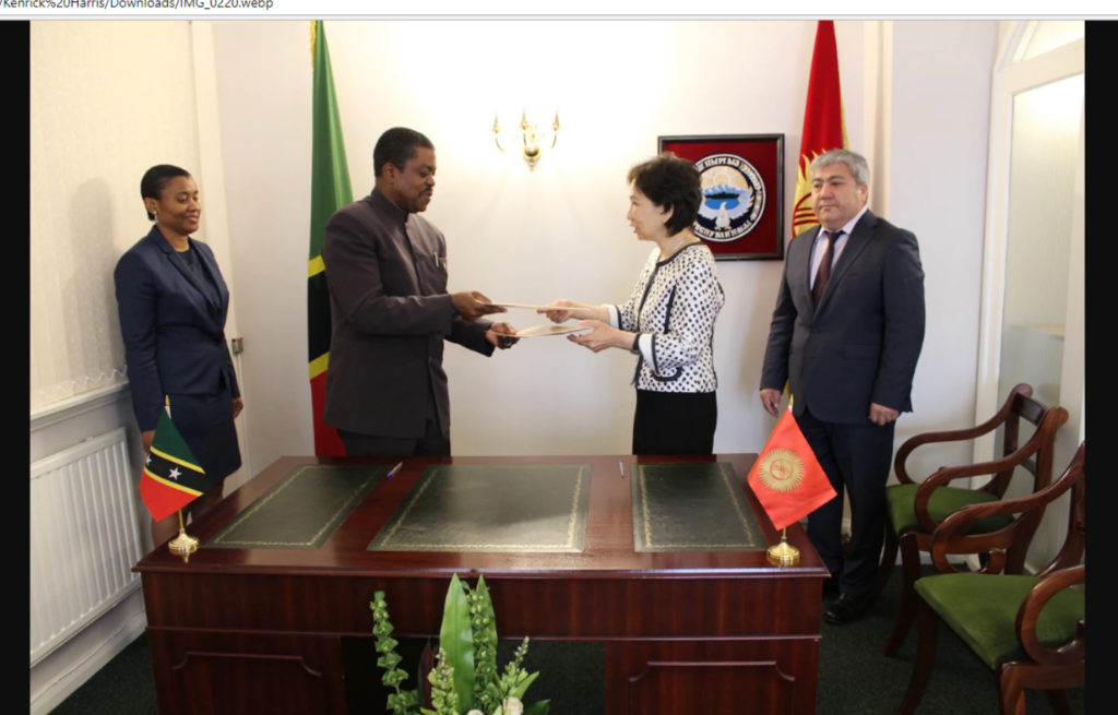 London, England– 8TH June 2018 – At a ceremony in central London in the Embassy of the Kyrgyz Republic, St. Kitts and Nevis High Commissioner, His Excellency Dr Kevin M. Isaac joined his colleague, the Ambassador of the Kyrgyz Republic, Her Excellency Mrs. Gulnara Iskakova to sign a joint communique establishing diplomatic relations. The joint communiqué formalises their two countries’ relationship and opens the way for more pragmatic partnerships. It also reflects the Federation’s commitment and the work of the Ministry of Foreign Affairs, in expanding the Federation’s diplomatic partnerships globally and in this specific case within Eurasia.