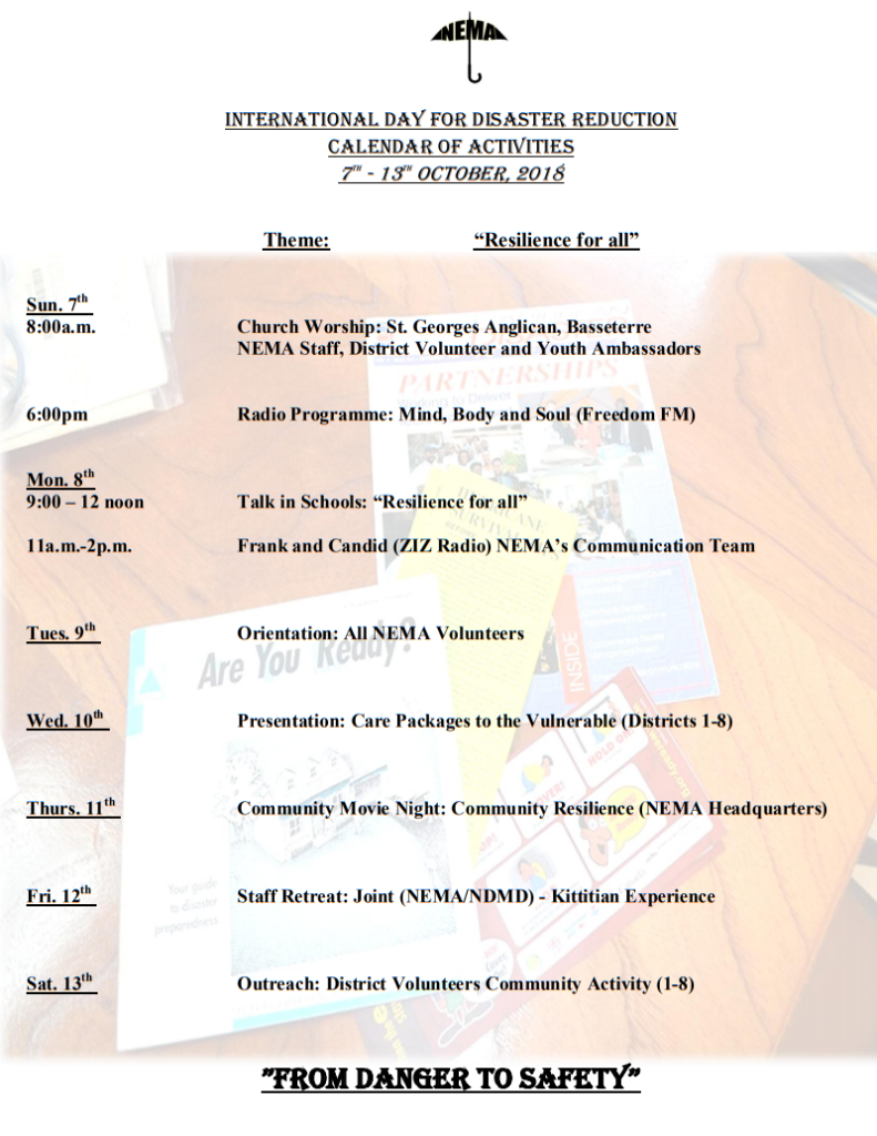 In St. Kitts-Nevis, NEMA and NDMD have taken that template to engage stakeholders, volunteers and community residents, through events and exercises that span a week, leading up to IDDR. For many years this exercise has comprised activities that enable resilience within all communities and groups by bringing awareness to Comprehensive Disaster Management.