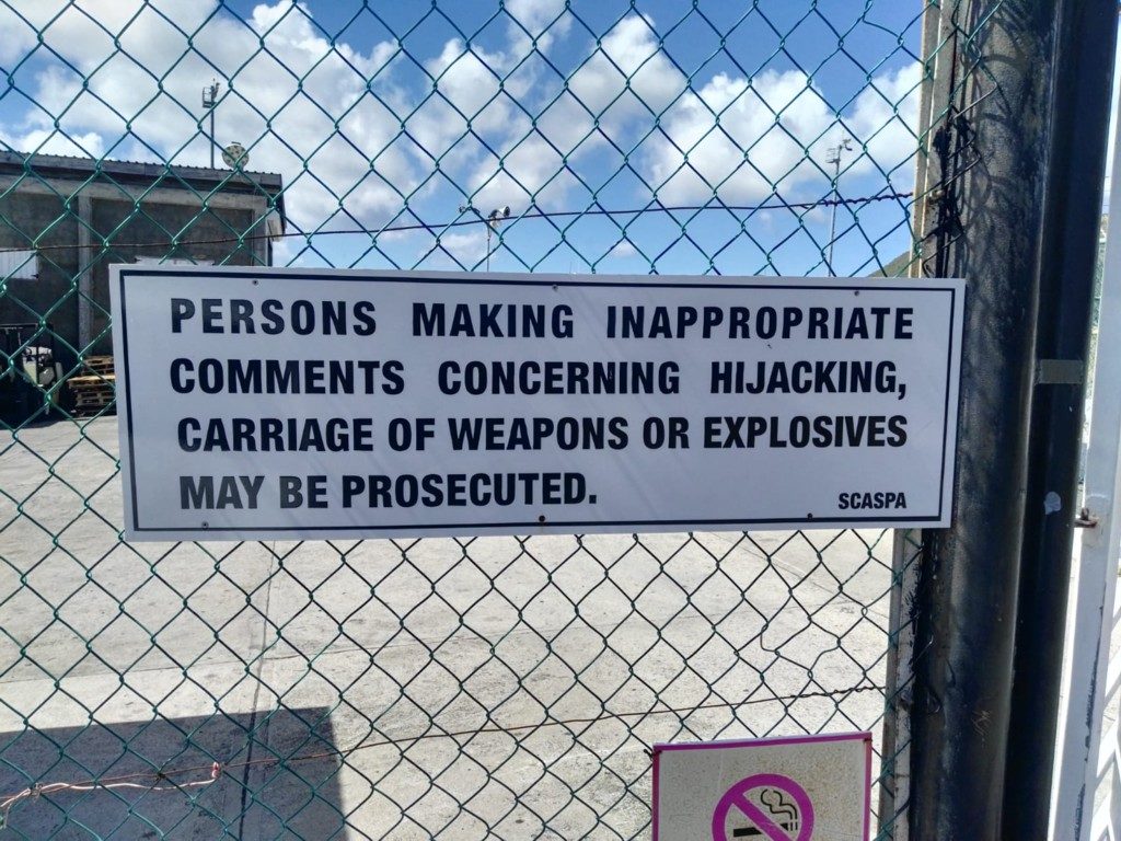 Signs mounted at the Robert L. Bradshaw International Airport in St. Kitts advise individuals of these restrictions. They read: “Persons Making Inappropriate Comments Concerning Hijacking, Carriage of Weapons or Explosives May Be Prosecuted.”