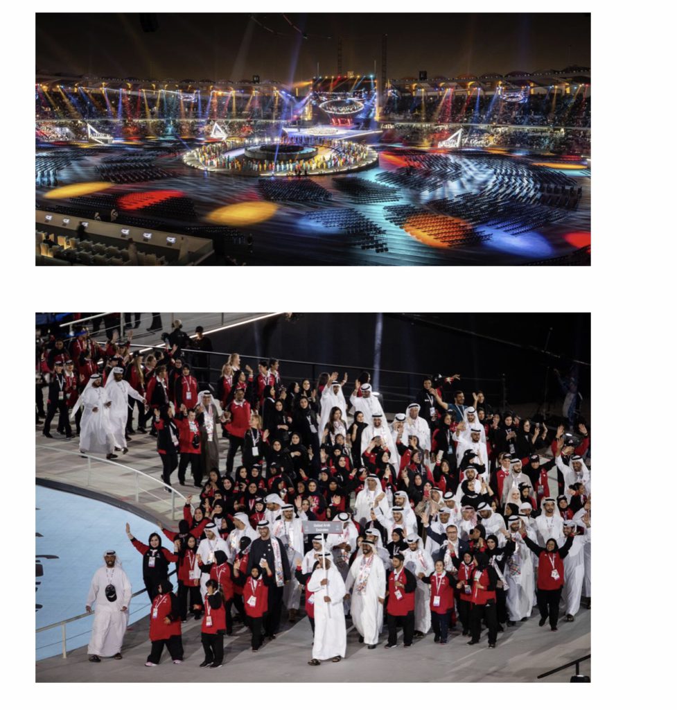 In a moment of incredible pride, joy and excitement, teams of athletes from the competing countries paraded into Zayed Sports City to a stirring and empowering chorus of cheers and claps from the crowd.