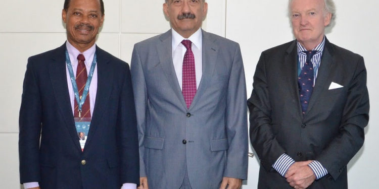 L-R: GENERAL MANAGER OF THE BRIMSTONE HILL FORTRESS NATIONAL PARK, MR. PERCIVAL HANLEY; MINISTER OF CULTURE OF THE REPUBLIC OF AZERBAIJAN, MR. ABULFAS GARAYEV; OFFICIAL REPRESENTATIVE OF ST. KITTS AND NEVIS TO THE WORLD HERITAGE COMMITTEE AND AMBASSADOR OF ST. KITTS AND NEVIS TO UNESCO, H.E. AMBASSADOR DAVID DOYLE.