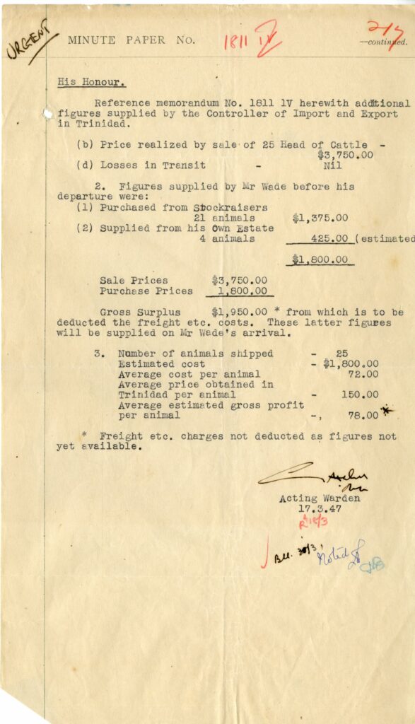 The Governor in Antigua communicated with the Acting Administrator H Burrows in St. Kitts that he would allow this export but wanted to know how much Wade was going to pay the owners of the cattle, the price he got for them in Trinidad, the cost of transport and losses in transit. The information was duly collected and submitted to the Administrator and showed that Wade had made a decent profit.