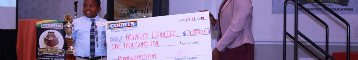 (EMU) – St. Kitts, November 14, 2019: Amassing a total of 393 points Rondre Daniel of the Maude Cross Preparatory School in Nevis rose to the occasion when he won the National Courts Competition finals on Wednesday November 13. Rondre emerged victorious from a field of five competitors from schools around St. Kitts and Nevis … Continue reading Rondre Daniel of Maude Cross Preparatory Wins 10th Annual Courts Reading Competition Finals in St. Kitts and Nevis