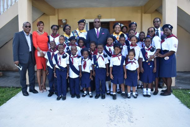 Prime Minister Harris and his Cabinet colleagues Hon. Ian Patches Liburd and Hon. Eugene Hamilton pose with Seventh-Day Adventist Pathfinders.