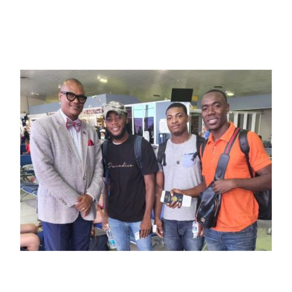 Dr. Hanley visited with the students, Hakim Blackmoore, Everton Liburd and Rasarles Nisbett as they waited to board the aircraft marking the start of a new journey in their lives.