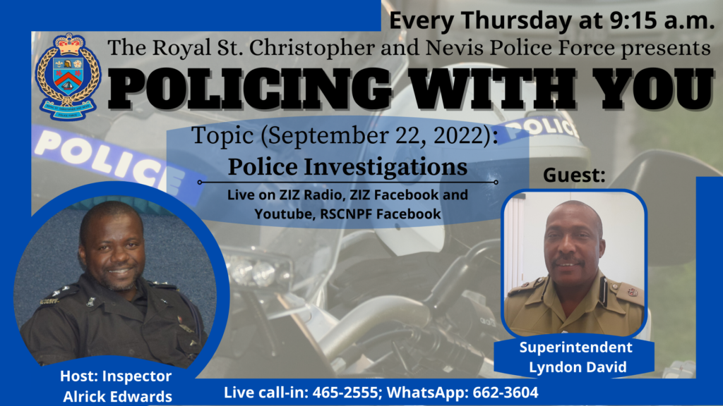 On tomorrow’s Policing With You, Superintendent Lyndon David will join host, Inspector Alrick Edwards to discuss the importance of Police investigations and following procedure. Policing With You is aired every Thursday on ZIZ radio from 9:15 a.m. You can also watch it live on the Facebook Pages of The Royal St. Christopher and Nevis Police Force and ZIZ Broadcasting, or catch it on the YouTube Channel of ZIZ Broadcasting. Have a question for our guests? Post it on any of our social media platforms, call 465-2555 or send it via WhatsApp at 662-3604.