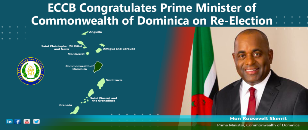 8 December 2022, Basseterre, Saint Christopher (St Kitts) and Nevis – The Eastern Caribbean Central Bank (ECCB) extends its congratulations to the Prime Minister of the Commonwealth of Dominica, the Honourable Roosevelt Skerrit, on his party’s re-election following the recently concluded general elections.