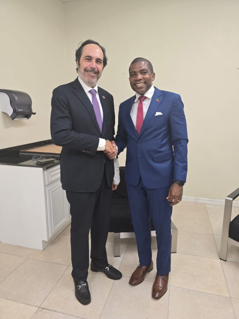 St. Johns, Antigua, May 28, 2024 (SKNIS): The Prime Minister of St. Kitts and Nevis, the Honourable Dr. Terrance Drew, and Minister of Foreign Affairs, the Right Honourable Dr. Denzil Douglas, held bilateral talks with Omar Shehadeh, Special Envoy of the United Arab Emirates (UAE) Minister of Foreign Affairs to the Caribbean and Pacific States. The discussions focused on critical issues such as water, sargassum, energy, and financing opportunities.