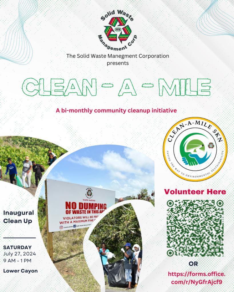 Basseterre,St. Kitts, July 18, 2024 – The Solid Waste Management Corporation (SWMC) is thrilled to announce the launch of the “Clean a Mile” campaign, an ambitious initiative aimed at enhancing the cleanliness and environmental sustainability of our beautiful island. We invite individuals, organizations, and businesses to join us in this crucial endeavor to maintain and improve our environment.