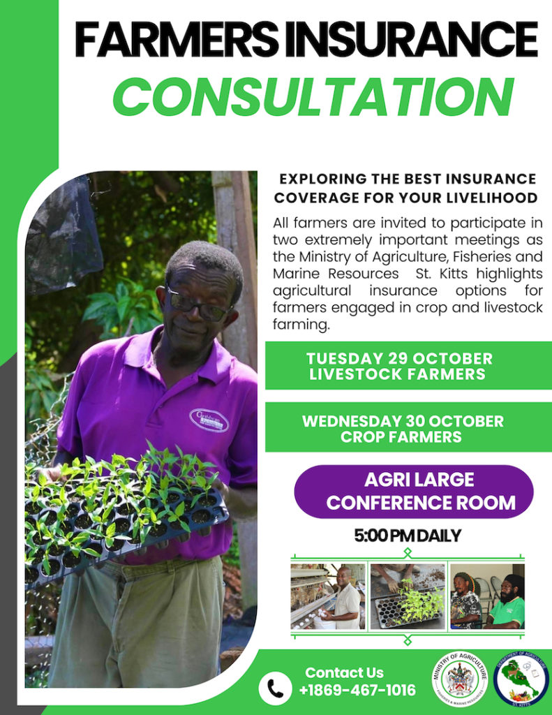 The Ministry of Agriculture, Fisheries, and Marine Resources in St. Kitts is pleased to announce a series of important consultations this month, designed specifically for the island’s crop and livestock farmers. These sessions will take place in the Large Conference Room of the Department of Agriculture, offering a vital opportunity for farmers to enhance their understanding of agricultural insurance.