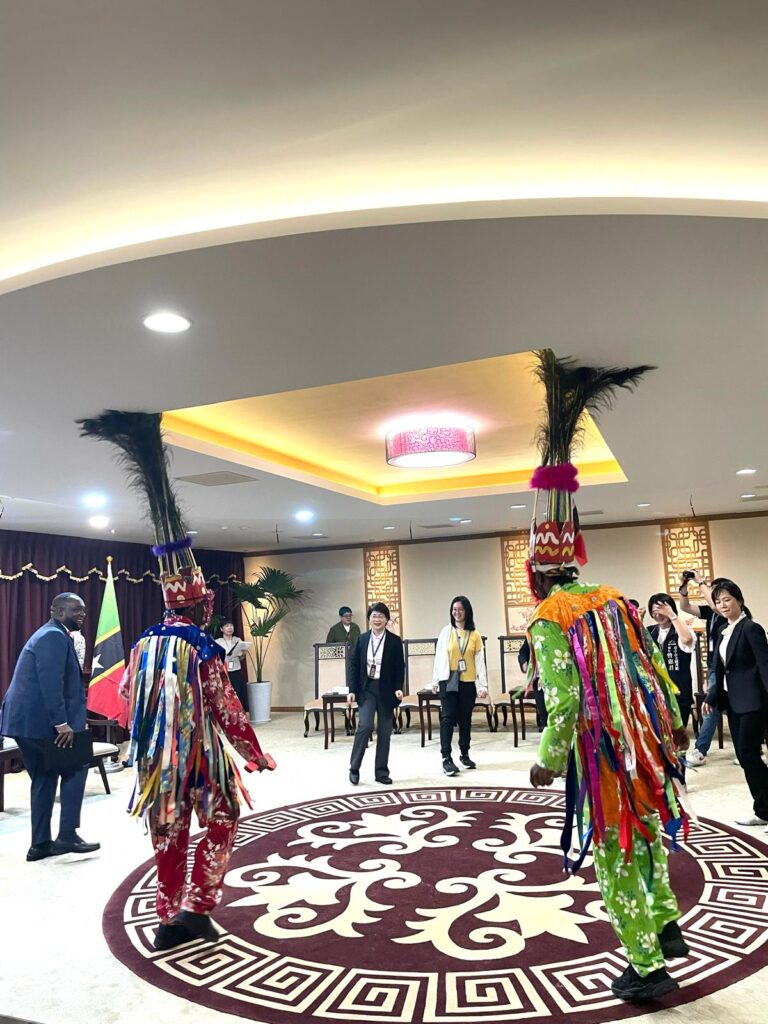 Kittitian students pursuing undergraduate studies in International Business and Trade at Ming Chuan University, Howard Liburd and Jahmarley Riley, gave a lively performance of the masquerade dance at the ceremony.