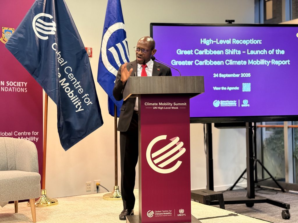 United Nations, New York (1 October 2025) – At the height of last week’s United Nations High Level Week the Federation’s Foreign Minister joined the Director General of the Organization of Eastern Caribbean States (OECS) and Secretary General the Association of Caribbean States (ACS) as well as leaders from the International Organization on Migration (IOM) and United Nations Office on Disaster Risk Reduction (UNDRR) to launch the Global Center on Climate Mobility’s “Great Caribbean Shifts” report. The Foreign Minister’s intervention centered climate risks and opportunities at the heart of the Federation’s foreign policy.