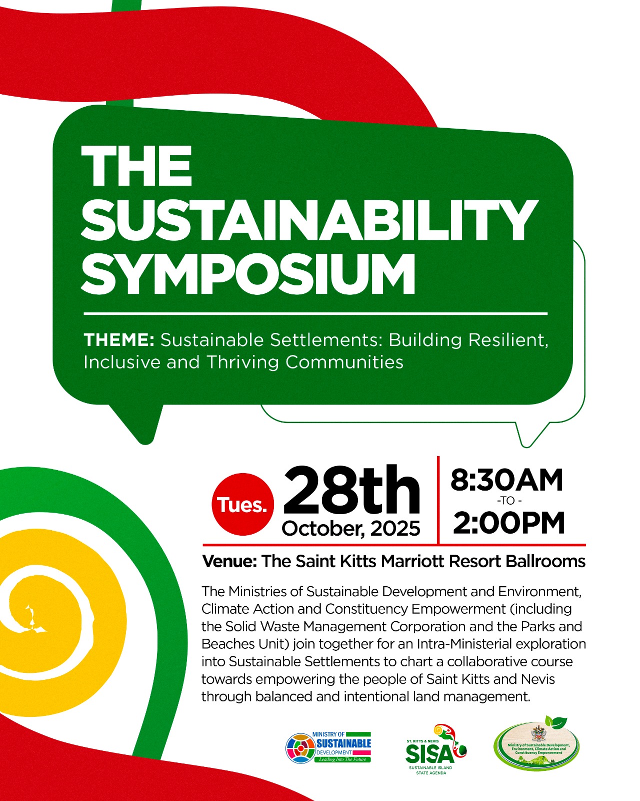 Basseterre, St. Kitts, 28 October 2025 – As a means of staff empowerment, awareness raising, and as a flagship close-out of October’s Sustainability Month celebrations, the Ministries of Sustainable Development and Environment, Climate Action, and Constituency Empowerment including the Solid Waste Management Corporation and the Parks and Beaches Unit joined together to host a staff Sustainability Symposium on Tuesday 28 October 2025 at the St. Kitts Marriott Resort under the theme “Sustainable Settlements: Building Resilient, Inclusive, and Thriving Communities”.