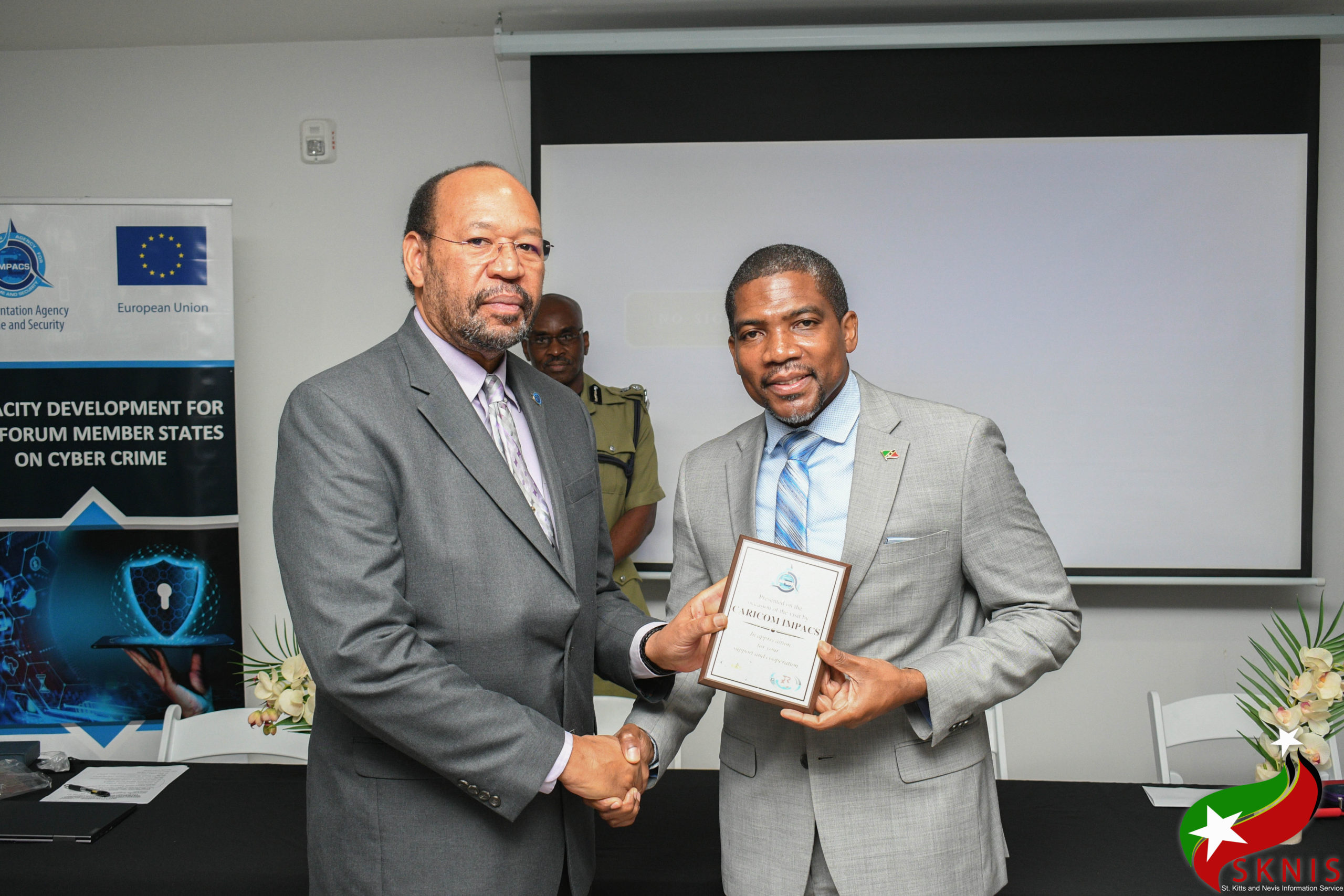 PM Dr. Drew (right) accepts plaque from Earl Harris, Assistant Director - CARICOM IMPACS Corporate Services